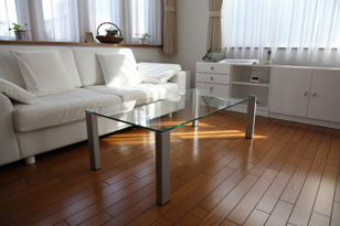 クリアガラスの天板にシルバーの脚のローテーブルを