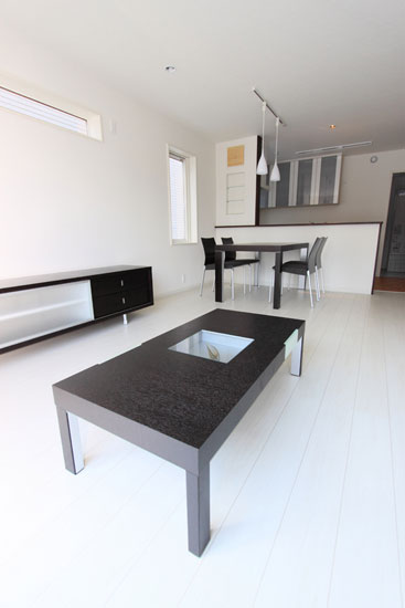 室蘭市港北町 イワクラホーム様モデルハウス スリガラスのダイニングテーブルとリビングテーブルは 同じデザインの製品で合わせて戴き 椅子はホワイト鏡面仕上げにする事で 清潔感のある明るい空間に落ち着いております。 ソファはライトグレーのレザーにブラウンの木製脚が ポイントとなり上品な空間を演出しております。