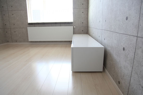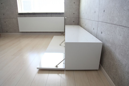 使い勝手を完全に無視した真っ白な箱の寝室用テレビボード リビングは落ち着いた色合いのダークブラウンでご依頼戴きましたが 寝室はホワイト色でご依頼戴きました。 白色鏡面仕上げのベッドの入荷をお待ち戴いているところです。