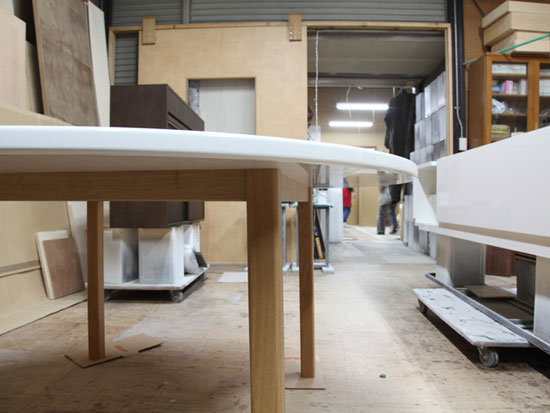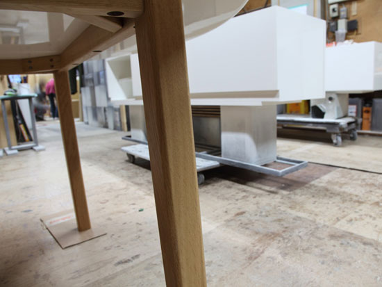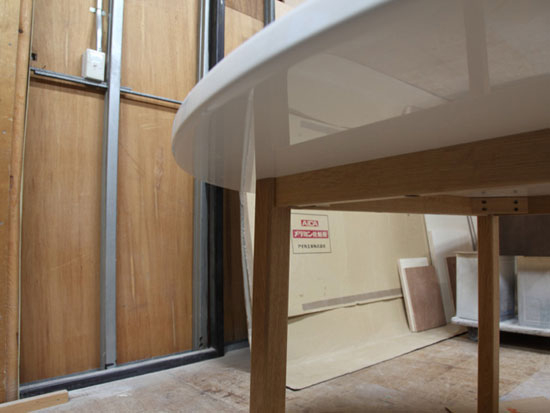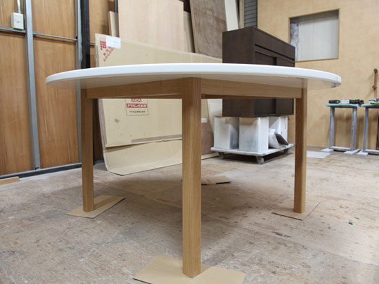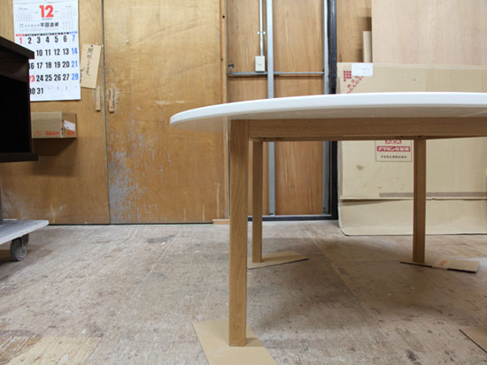 札幌市中央区 Y様邸 Ф1400 H700 6人掛けの円形ダイニングテーブルのご依頼を戴きました。 幼いお嬢様のために天板や脚の角を丸めた優しい形状に仕上ております。 既製品ではまずお目にかかれないサイズの天板ですが 重苦しくなく軽量感を持たせながら テーブルとして安定感を持たせるために 天板の厚みや脚の太さに気をつけて また脚をほんの少しだけ外側へ傾けてます。