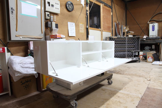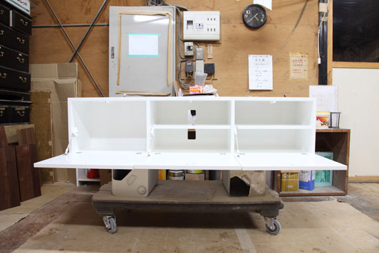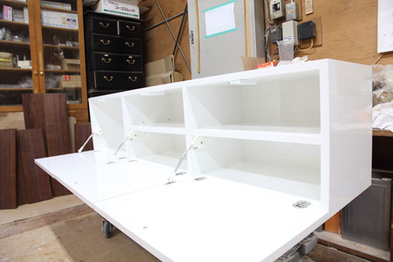 大阪府大阪市 T様 特注テレビボード W1600 D350 H400mm 白色鏡面仕上げ フラップ扉(ソフトダウンステー、ドロップ丁番)