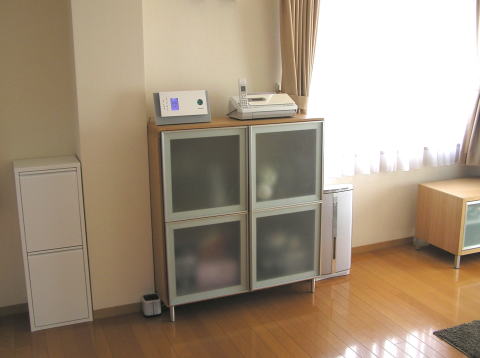 スリガラスのキャビネット(上)、ナチュラルカラーのテレビ台(下)