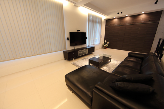 3m20cmのカウチソファ(ブラックレザー)とローテーブル また、壁掛けテレビには2m40cmの大型テレビボードを合わせて戴きました♪