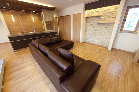 0054 カウチソファを特注で肘掛を通常の35cmから薄くして最低限の動線を確保するようご提案致しました。